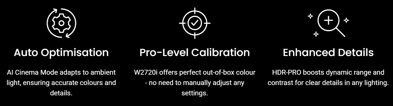 A key selling point of the W2720i is its suite of features designed to enhance the viewing experience. These include a gorgeous 4K resolution, HDR-PRO technology for improved contrast and colour depth, and what BenQ terms “AI Cinema Mode,” which optimises image settings based on the content being displayed and ambient room conditions. Connectivity options and ease of setup are also important considerations for a home cinema projector, and BenQ seem to have made some strides there too.