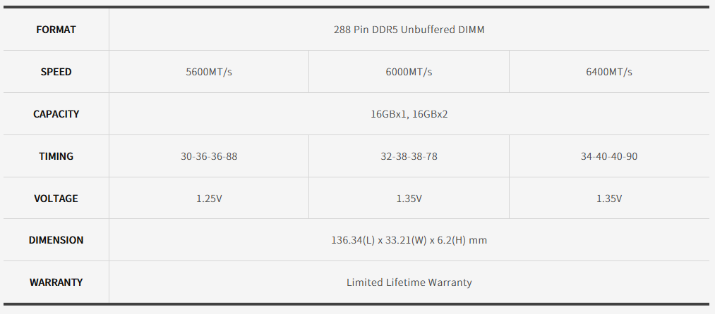 The KLEVV FIT V DDR5 RAM offers a range of speed options, from 5600MT/s up to a speedy 6400MT/s, catering to various performance and budgetary needs. It’s available in capacities of 16GB (single or dual modules) to suit different system builds. The timings are reasonably tight, especially at the higher speeds, ensuring efficient data access. While the voltage requirements increase slightly with speed, they remain within standard DDR5 ranges. The limited lifetime warranty provides peace of mind for long-term use, although that’s pretty much the industry standard anyway.