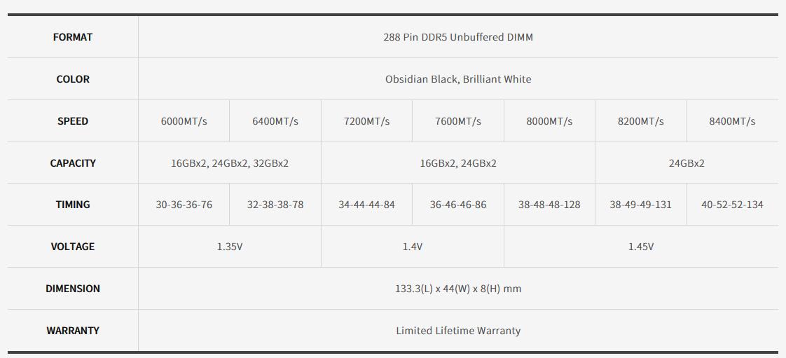 When it comes to high-quality and high-performance memory products, few brands can match what KLEVV has to offer. While we’ve been impressed with their previous products that we’ve reviewed, the new KLEVV CRAS V RGB is packing some very high-end features of its own, so that trend is likely to continue. Available in 16GB, 24GB and 32GB DIMMs, with a range of speeds from 6000 MT/s up to a blisteringly faster 8400 MT/s, a range of timing that goes as low as 30-36-36-76 and a choice of their stunning Obsidian Black or Brilliant White and all with RGB lighting, there should be a CRAS V kit to suit any PC enthusiasts needs.