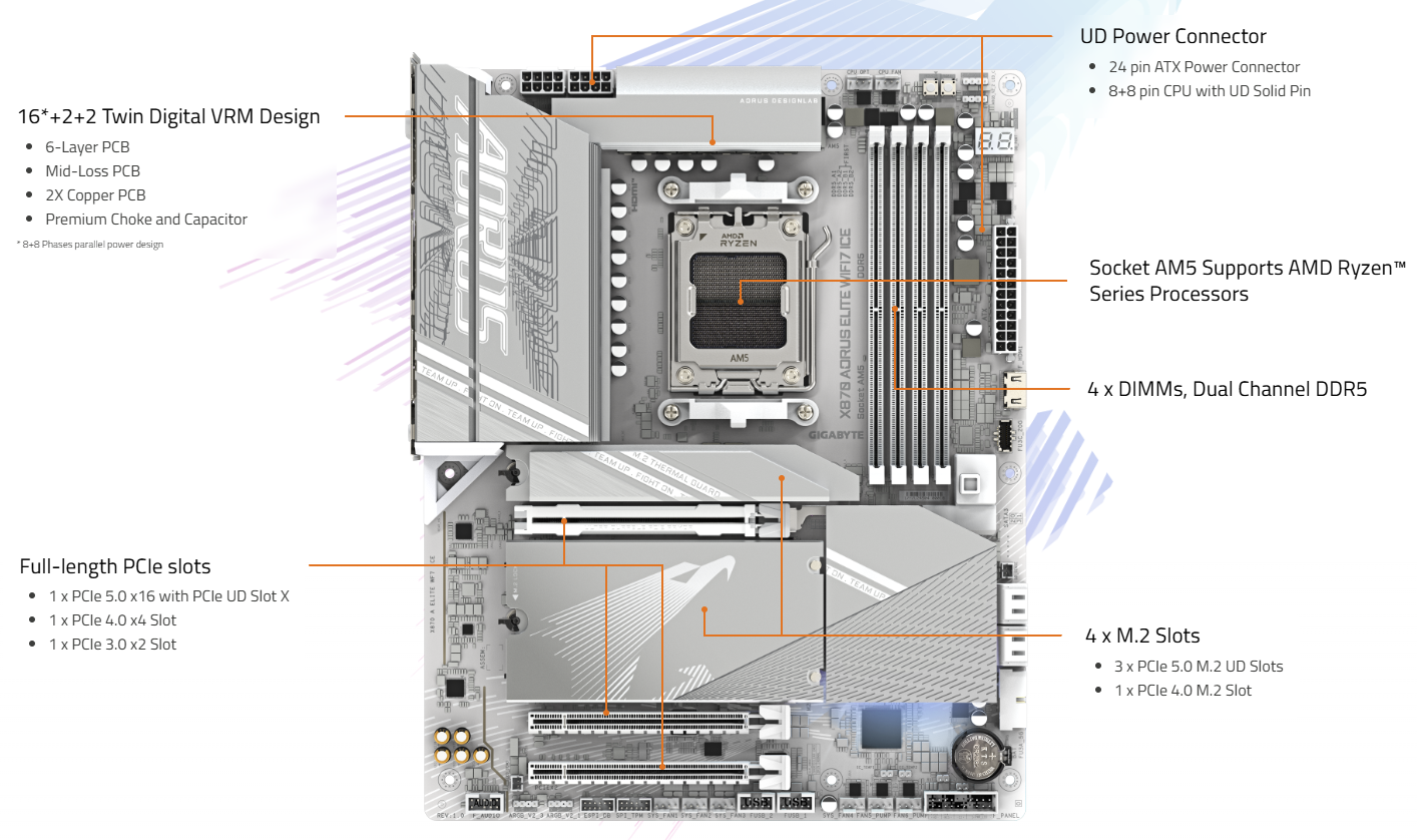 - PCIe UD Slot X: PCIe 5.0 x16 slot with 10X strength for graphics cards