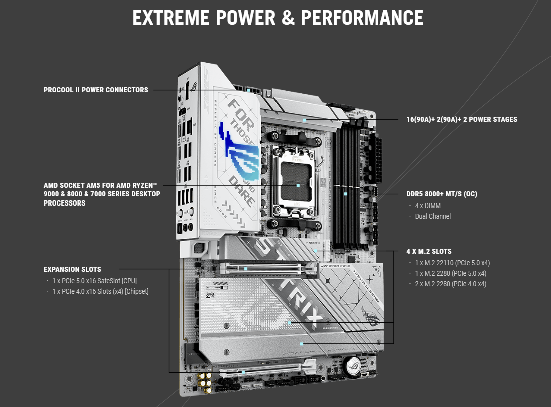 Elevate your build with the ROG Strix X870-A Gaming WiFi. Featuring a sleek white PCB and support for AMD Ryzen™ 9000 Series processors, this motherboard delivers the power and connectivity needed for advanced AI applications. With DDR5 support, full PCIe 5.0 capabilities, dual USB4® ports, and WiFi 7, it’s the ultimate blend of style and performance.