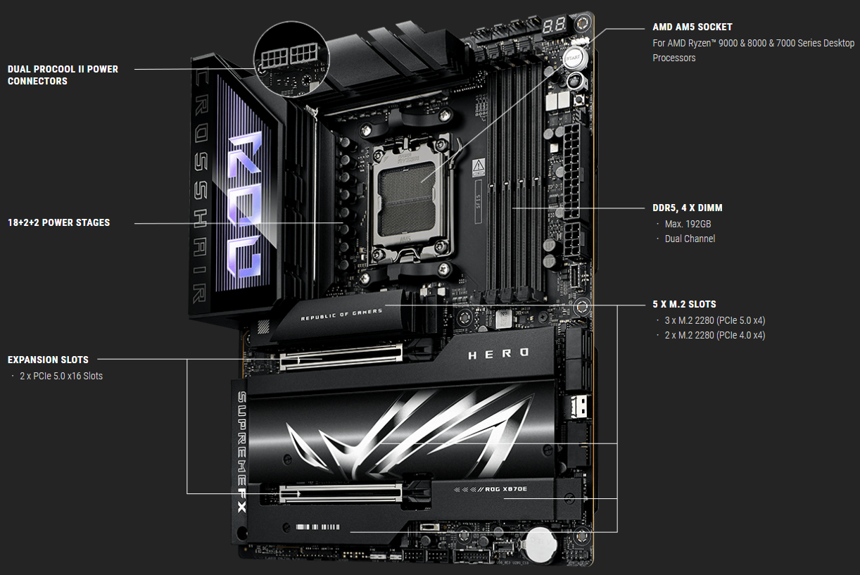 “The AI PC-ready ROG Crosshair X870E Hero offers unyielding power delivery, robust thermal management, hyperspeed connectivity, and comprehensive PCIE 5.0 and DDR5 support to unleash the performance of AMD Ryzen 9000 Series processors. Dark hues predominate across this motherboard, drawing your attention to premium metallic textures, nickel-plated surfaces, sleek contours and a stereoscopic visual effect on the large M.2 and chipset heatsink. This board also features the Polymo Lighting II effect. This upgraded lighting module built into the I/O shroud provides more dynamic RGB illumination for the signature ROG logo.” – ASUS