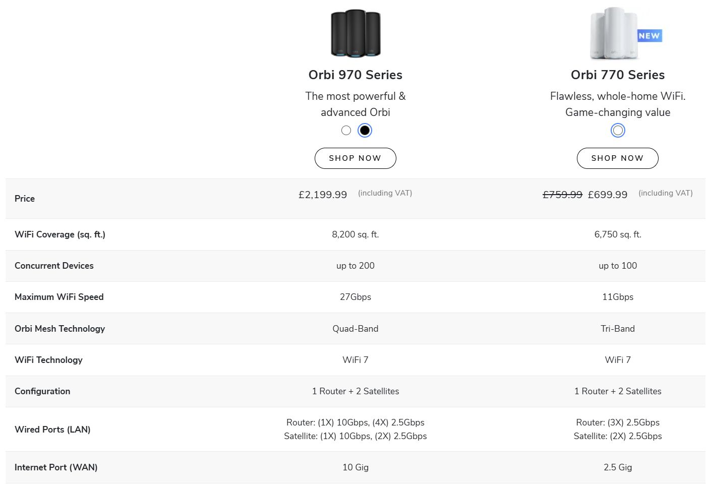 As you can see, compared to the popular Orbi 770 series, the Orbi 970 is a lot more expensive, coming in at £2199.99 for the triple pack system; that’s the base unit plus two satellite units. However, it offers up to 200 concurrent devices, double that or the Orbii 770, as well as quad-band networking, 27 Gbps network speeds, 10GbE LAN ports, and coverage of around 8200 sq. ft. Of course, that’s total overkill for most users, but for the ultra-fast speed internet lovers with extensive amounts of tech and smart home devices, it’s going to be ideal.