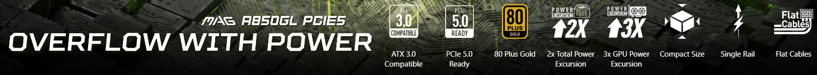 “The MAG A850GL PCIE5 power supply provides 80 PLUS Gold-certified power efficiency, ATX 3.0 compatibility, and PCIe 5.0 GPU support, cooled by a 120mm fluid dynamic bearing (FDB) fan for superior performance. Outfitted with a full-bridge LLC DC-to-DC topology, an extra-compact ATX frame, and a fully modular design, this PSU is ideal for spatially-efficient PCs requiring robust, no-nonsense performance.” – MSI