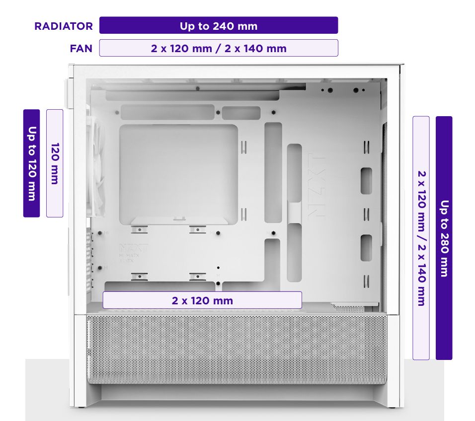 - Fan: Holds 2 × 140 mm in front, 2 × 120 mm in top, 2 × 120 mm on bottom, and 1 × 120 mm in rear.