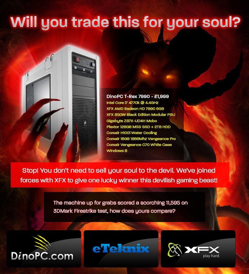 In the past few years we have had some truly amazing giveaways at eTeknix such as our £1000 PC Specialist Gaming System giveaway in March 2013 and our Big Get Active Xmas giveaway in December 2012. Today we are raising the bar once again as we unveil to you our latest giveaway. eTeknix, in association with DinoPC and XFX, are giving away a DinoPC T-Rex 7990 pre-built gaming PC worth an amazing £2000/$3000.